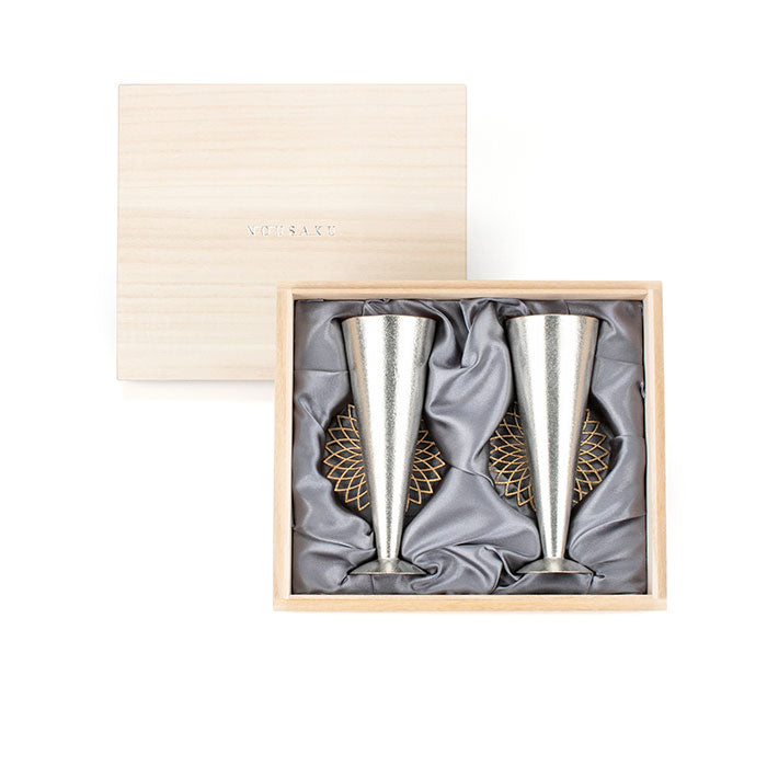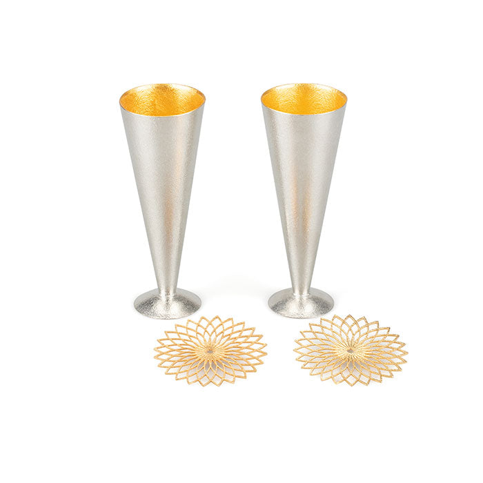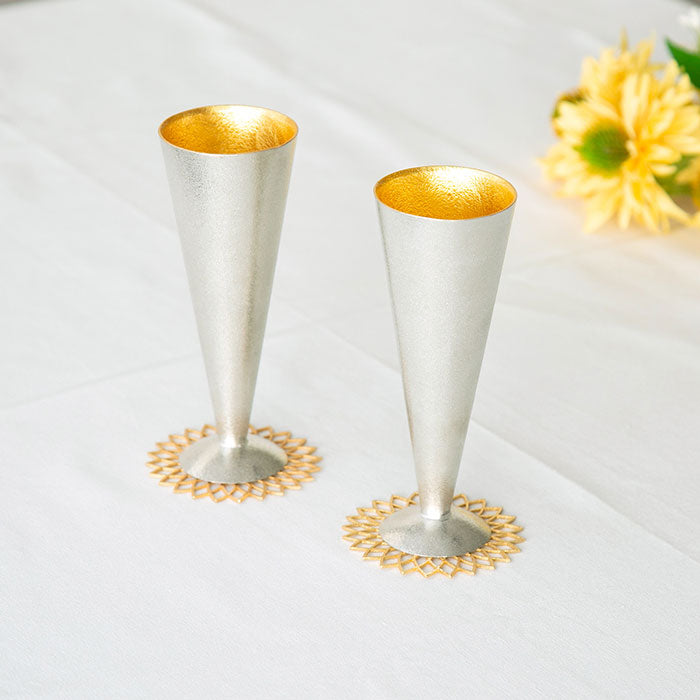 A champagne glass with gold leaf on the inside that looks great with champagne. We collaborated with gold leaf, a traditional craft representing Kanazawa. The sparkle of the gold leaf makes the champagne bubbles stand out. In addition, trumpet-shaped champagne glasses that bring out the aroma of ginjo-style sake, which is called kunshu, are well suited.