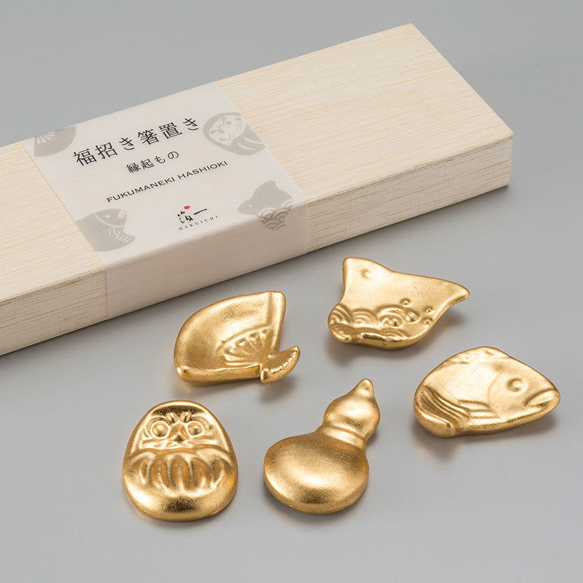 【和紙でラッピング済】 箔一 福招き箸置き 縁起もの 5個セット