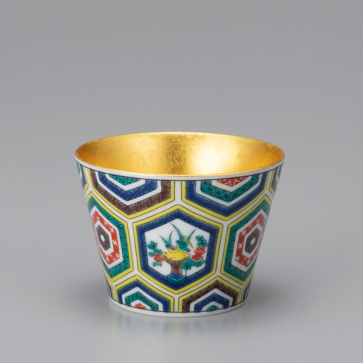 - 伝統的な九谷焼の鮮やかな色彩と金箔の輝きが目を引くフリーカップです。日本酒にはもちろん、アイスクリームなどのデザートボールにもお使いいただけます。マットに仕上げた金箔の輝きが、九谷焼の優美な絵模様と色彩を一層華やかに彩ります。 重ねて保管できるのでコレクションとしても楽しい器です。