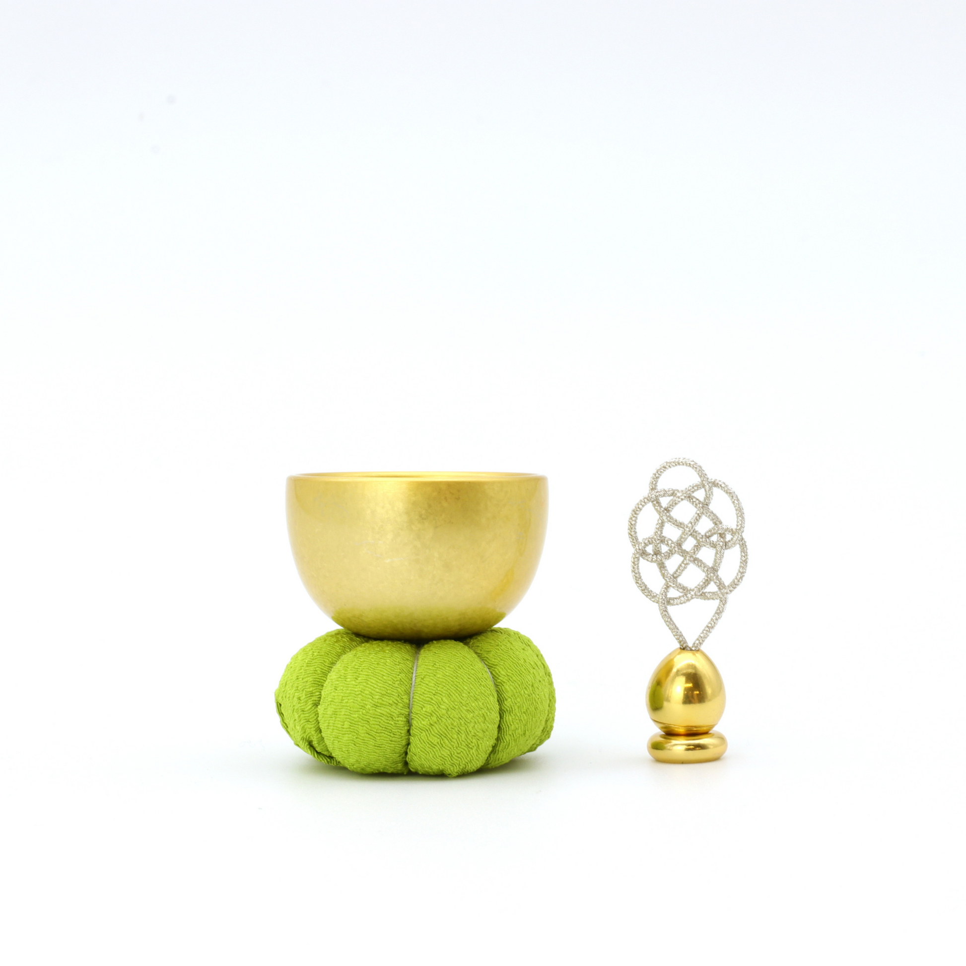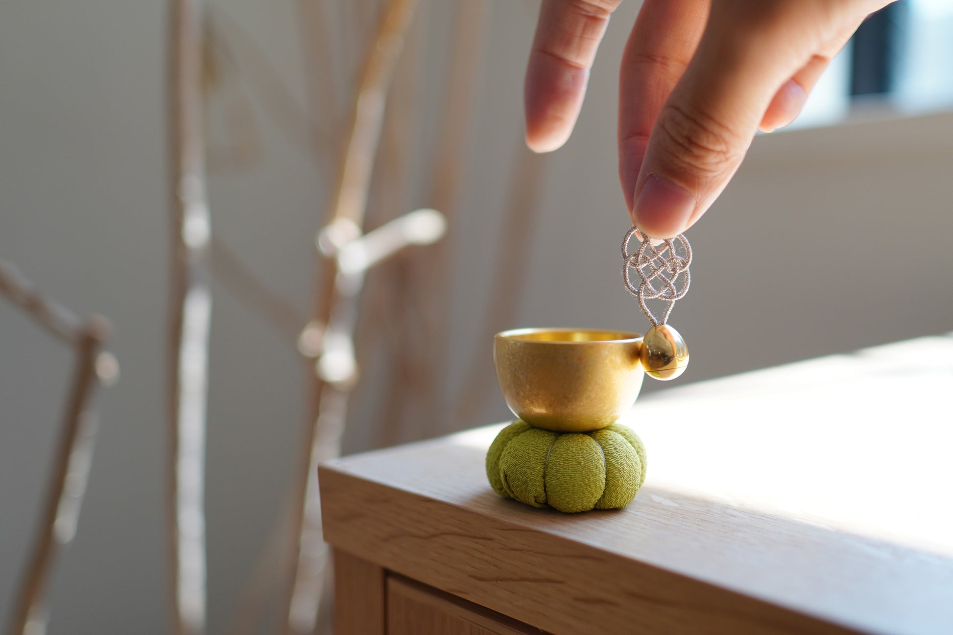 座禅で使われる座布に佇む「ざふりん」から響く澄んだ音色は、日常に癒しのときを添えてくれるでしょう。健やかな日々を願う吉兆結びの「亀結び」の組紐りん棒は、りん棒台に乗せると自立します。おりんの中に収めると亀結びがちょこんと顔を出すかわいいらしい姿になります。鳴らしてすぐに中に収めても音色が消えることはありません。