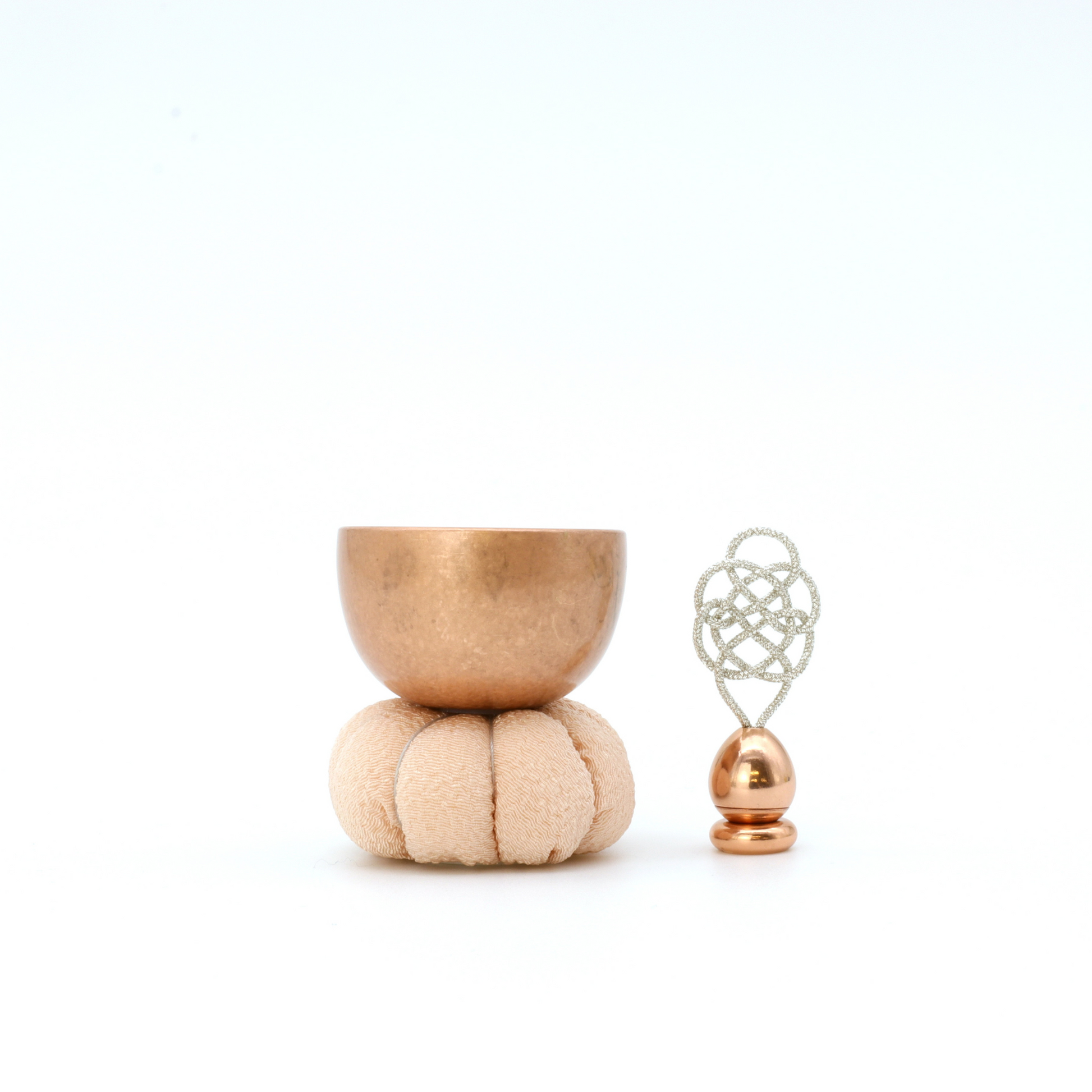 座禅で使われる座布に佇む「ざふりん」から響く澄んだ音色は、日常に癒しのときを添えてくれるでしょう。健やかな日々を願う吉兆結びの「亀結び」の組紐りん棒は、りん棒台に乗せると自立します。おりんの中に収めると亀結びがちょこんと顔を出すかわいいらしい姿になります。鳴らしてすぐに中に収めても音色が消えることはありません。
