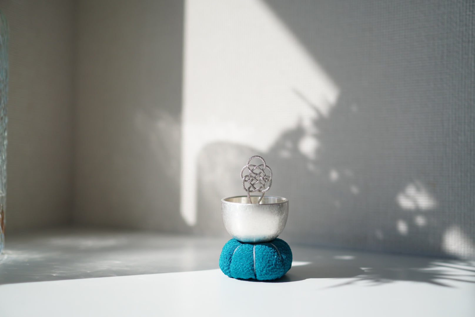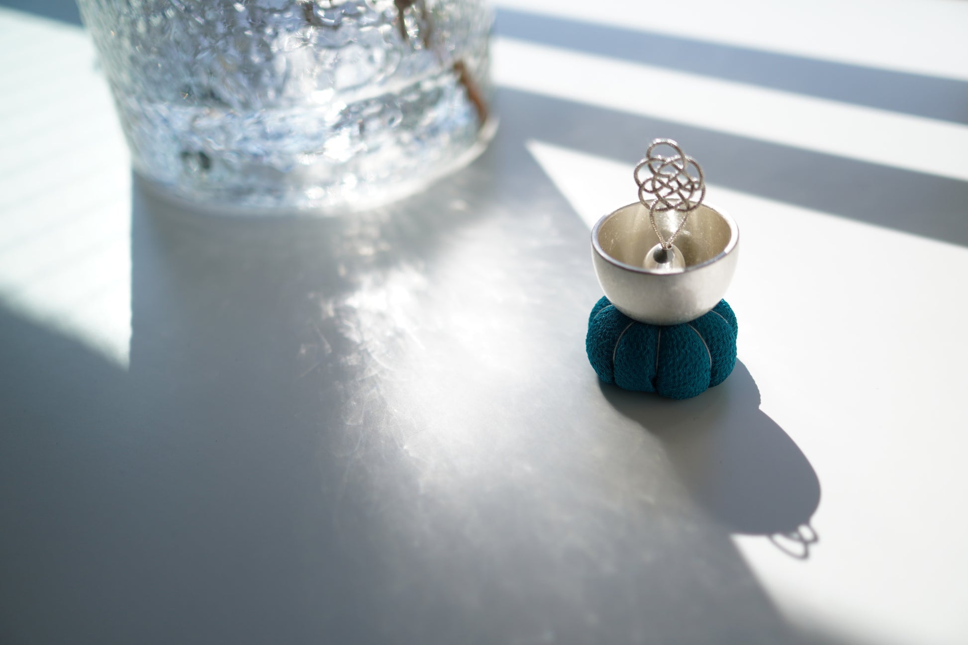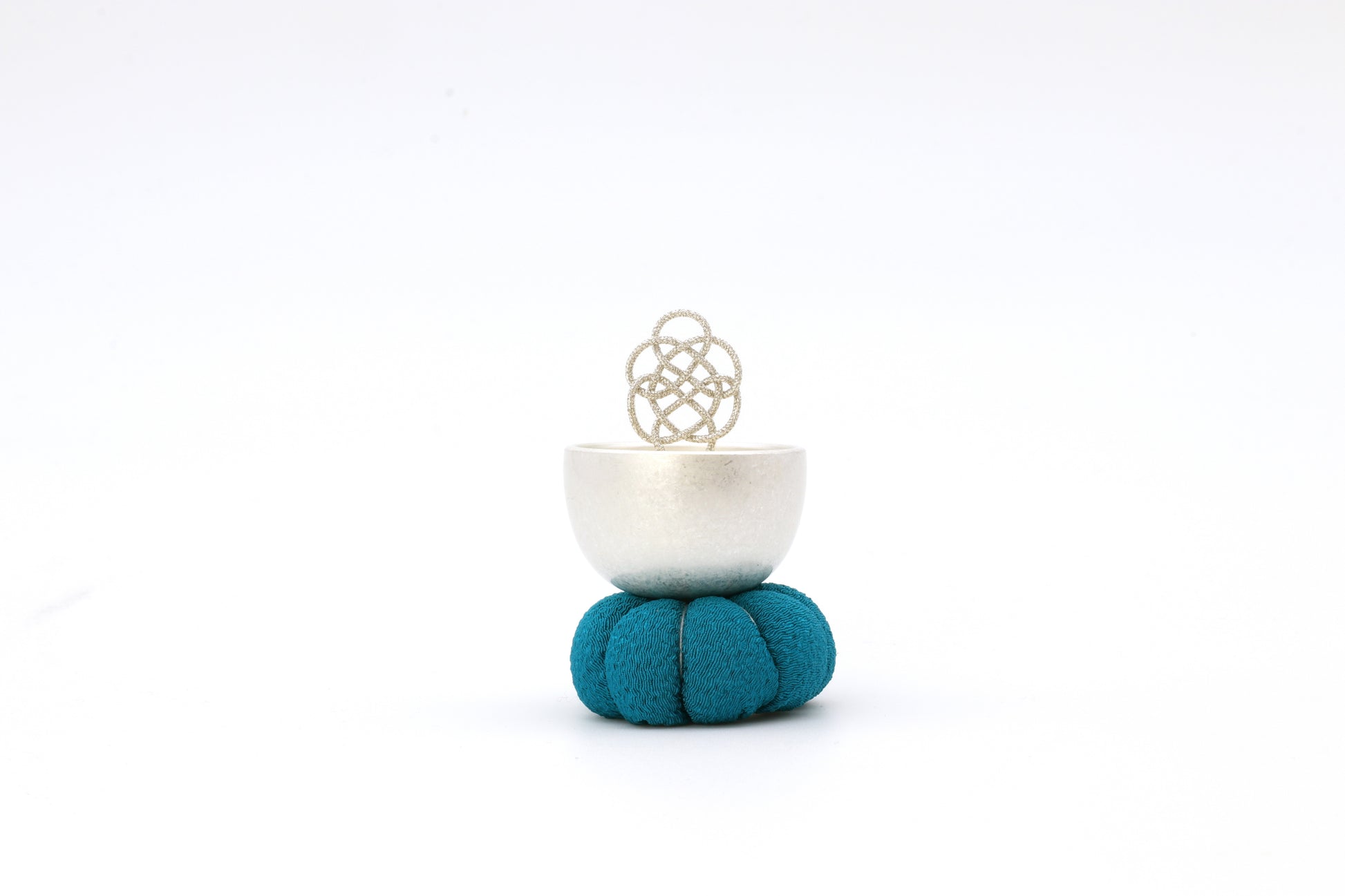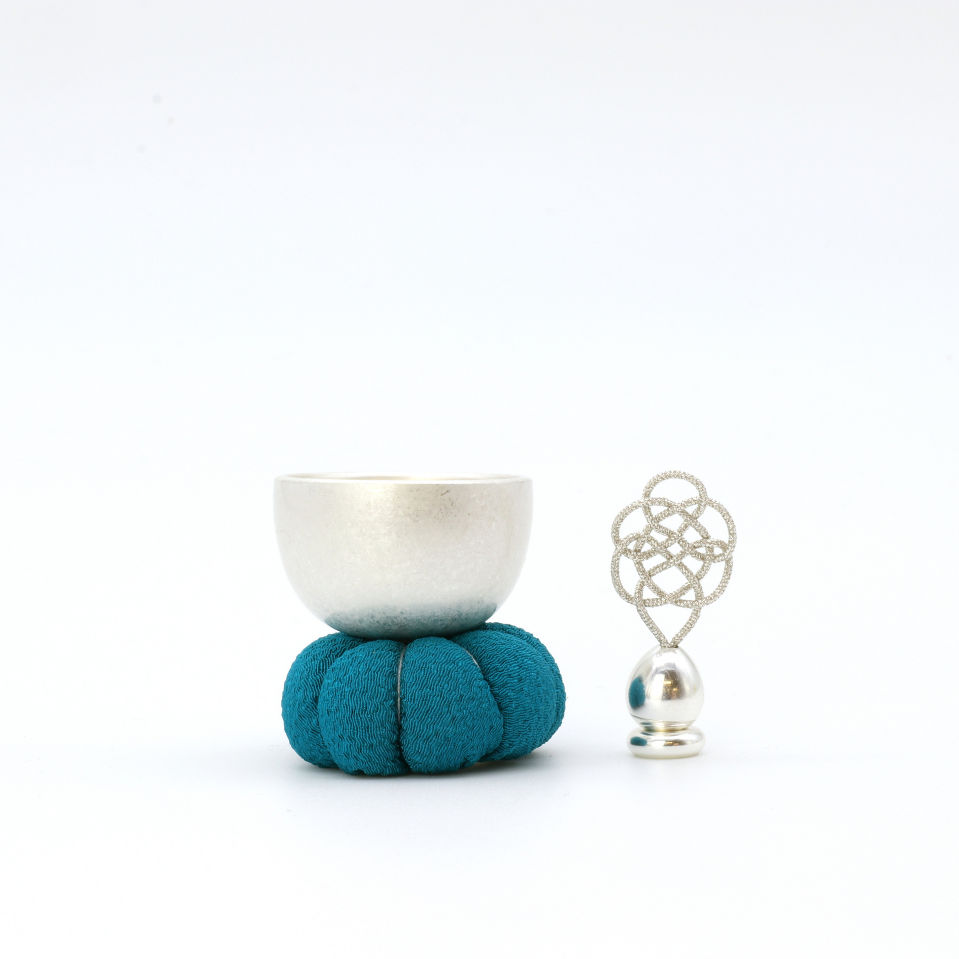 座禅で使われる座布に佇む「ざふりん」から響く澄んだ音色は、日常に癒しのときを添えてくれるでしょう。健やかな日々を願う吉兆結びの「亀結び」の組紐りん棒は、りん棒台に乗せると自立します。おりんの中に収めると亀結びがちょこんと顔を出すかわいいらしい姿になります。鳴らしてすぐに中に収めても音色が消えることはありません。