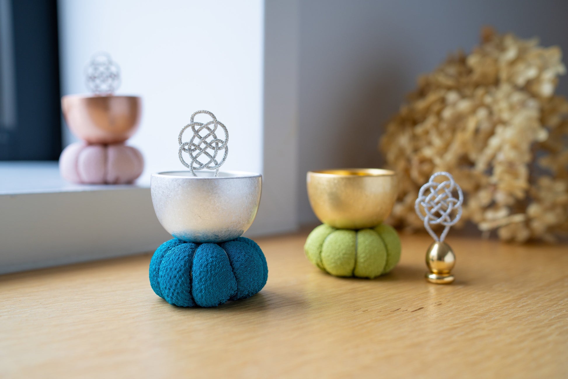 柔らかな色彩の座布(ざふ)と組紐を使用したりん棒を組み合わせた「ざふりん」は、思わず笑みが溢れるような愛らしい存在感。