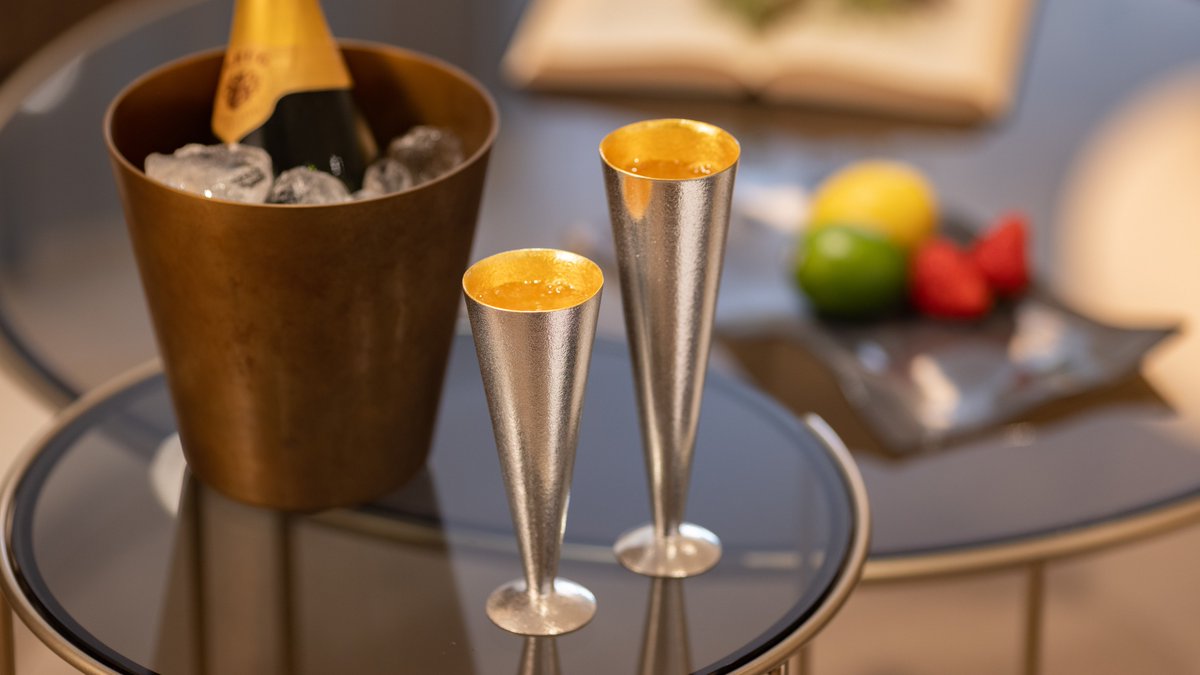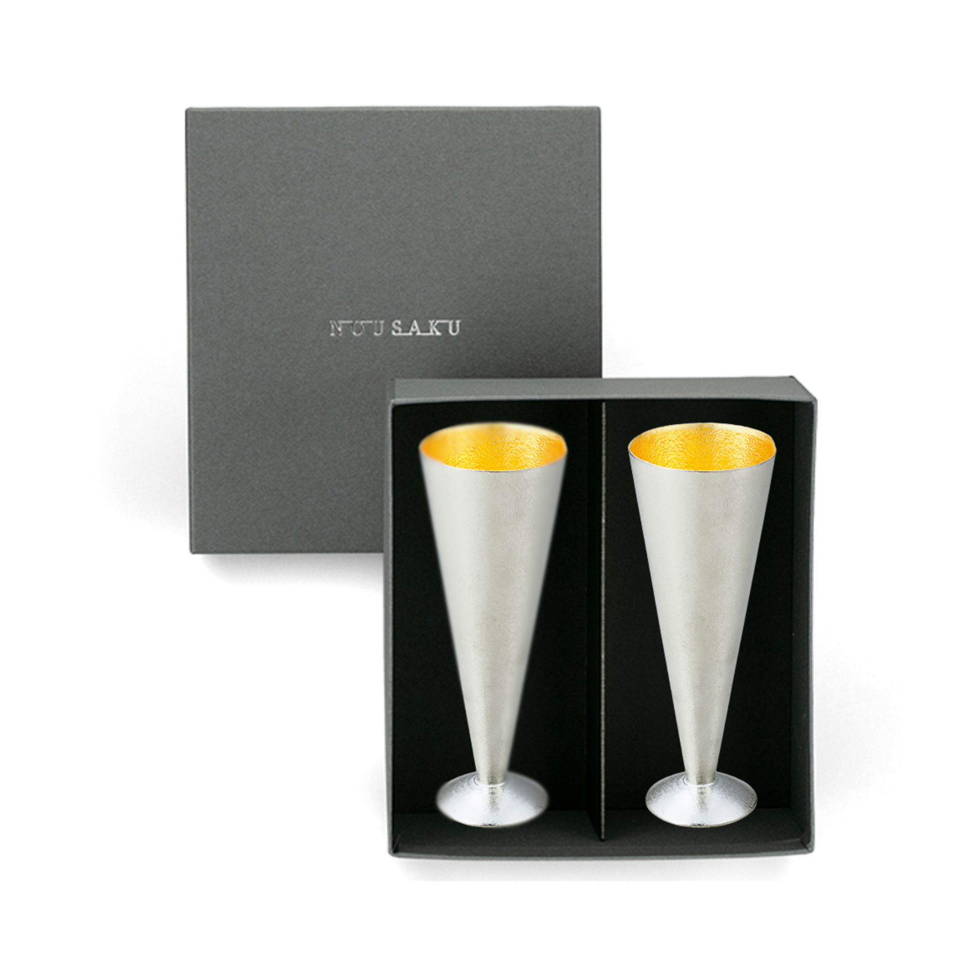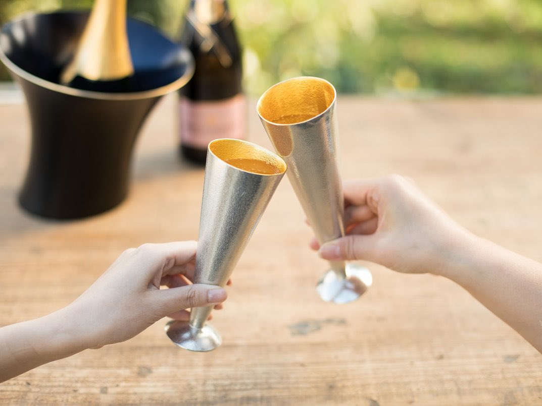 金沢を代表する伝統工芸品、金箔とコラボレーションしました。金箔の輝きによりシャンパンの泡がひときわ映えます。また、薫酒と呼ばれるような香り高くフルーティーな吟醸系の日本酒にも、その香りを引き立てるラッパ型のシャンパングラスがよく合います。薄手の飲み口や縦に長い形状も、繊細な吟醸酒を味わうのにピッタリです。