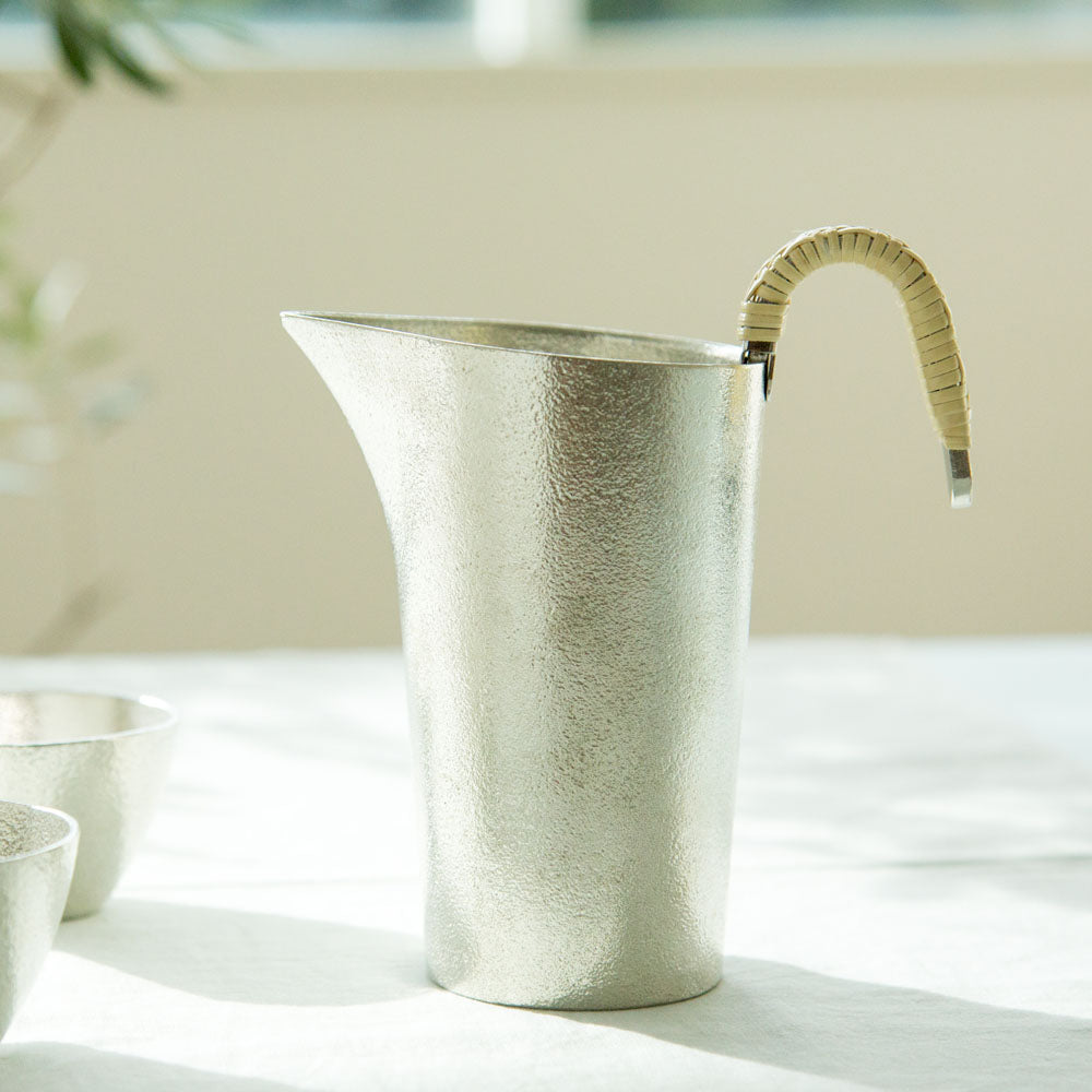 熱伝導率の良い錫の特性を生かしたちろりです。 ちろりとは、燗をつけるための酒道具。湯煎にかけてお使いください。湯煎の際、熱伝導率が高いため 錫自体も高温になります。籐を巻いている箇所をお持ちください。