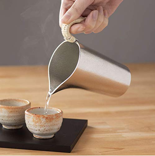 熱伝導率の良い錫の特性を生かしたちろりです。 ちろりとは、燗をつけるための酒道具。湯煎にかけてお使いください。湯煎の際、熱伝導率が高いため 錫自体も高温になります。籐を巻いている箇所をお持ちください。