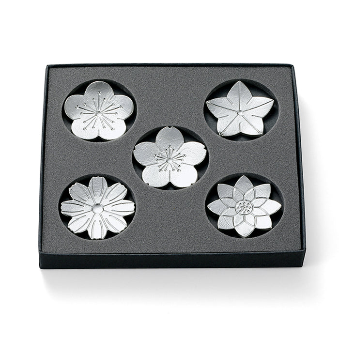 愛らしいお花の形の箸置の5ヶセットです。梅・桜・桔梗・コスモス・蓮の5種類の花々が食卓を彩ります。錫は、抗菌性に優れているため食器として安心してお使いいただけます。ままた、錫100%でやわらかいので、端を曲げてお好きな形にしてお使いください。通常の錫製品は硬度を持たせるため他の金属を加えますが、能作では何も加えず、錫本来の持ち味を最大限に生かしました。華やかな花々の箸置きは、贈り物などにもおすすめです。