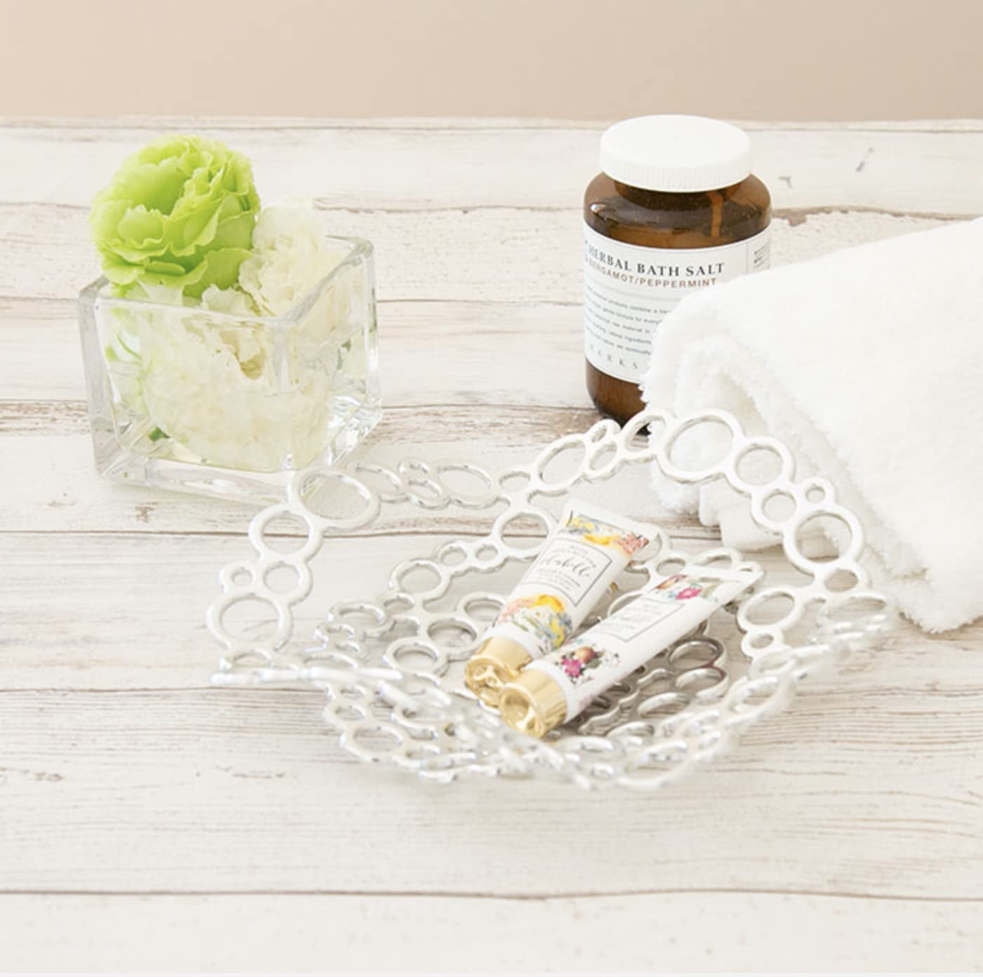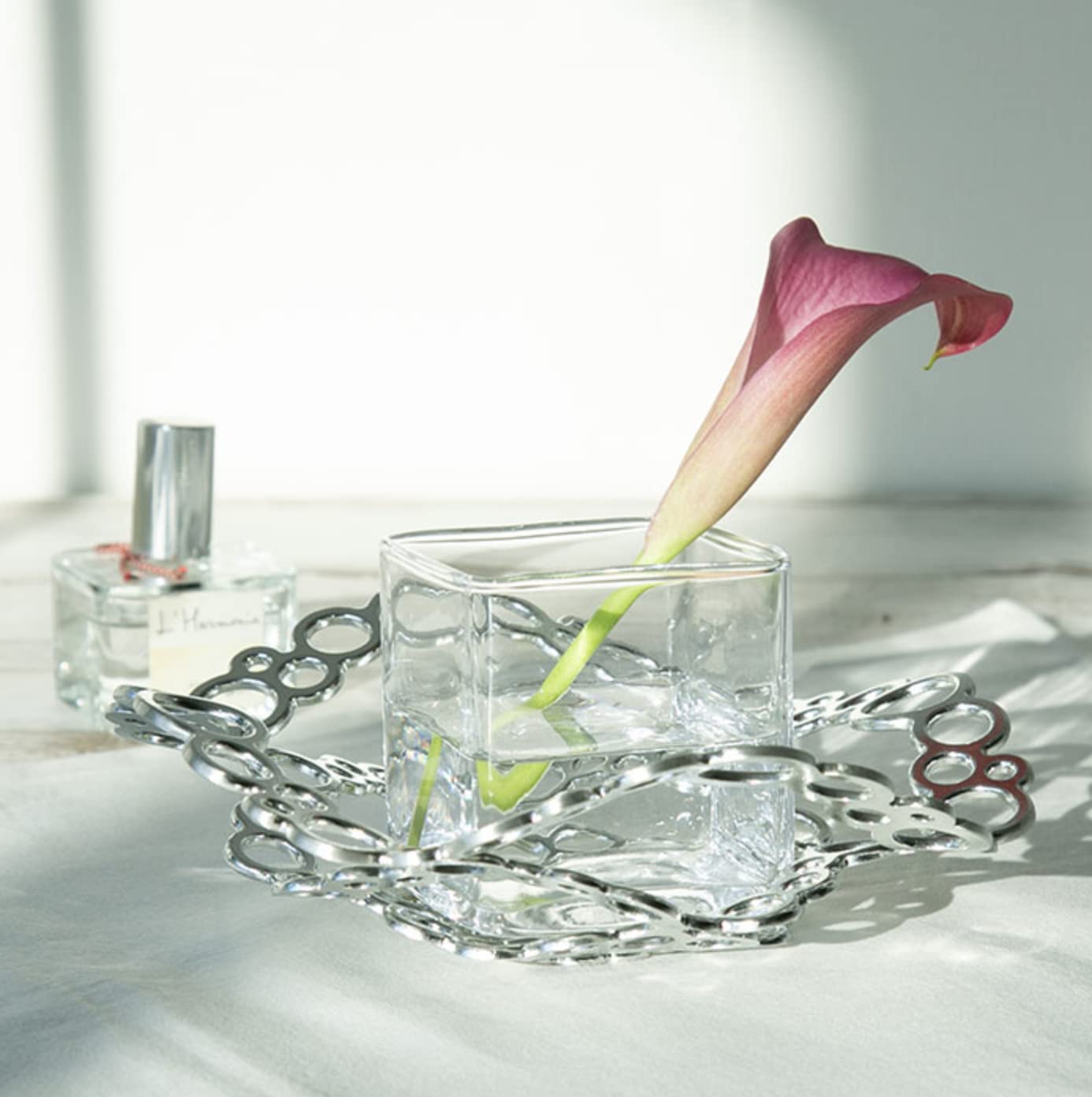 これまでと変わらず錫100%の柔らかさを最大限に生かしているので形をカゴ状に変えて、フルーツトレイや菓子器、アメニティグッズのトレイとして様々なシーンでご利用いただけます。