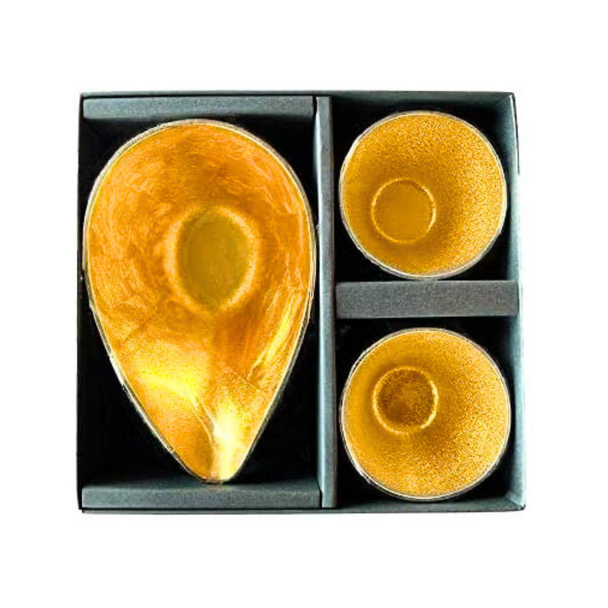 錫100%片口 中 (1合にぴったり)・金箔1ヶとぐい呑 金箔2ヶのセットです。 金箔の輝きがより一層日本酒をひきたてます。錫は古来より、「錫の器に入れた水は腐らない」、「お酒の雑味が抜けて美味しくなる」などといわれ、酒器や茶器などに用いられてきた金属。また、熱伝導率が良いため冷蔵庫に1-2分入れることで器自体が冷たくなり、冷酒がより一層おいしくお楽しみいただけます。 和紙でラッピングしております。 つ一つ職人が手作業で仕上げています。贈り物にもおすすめの商品です。