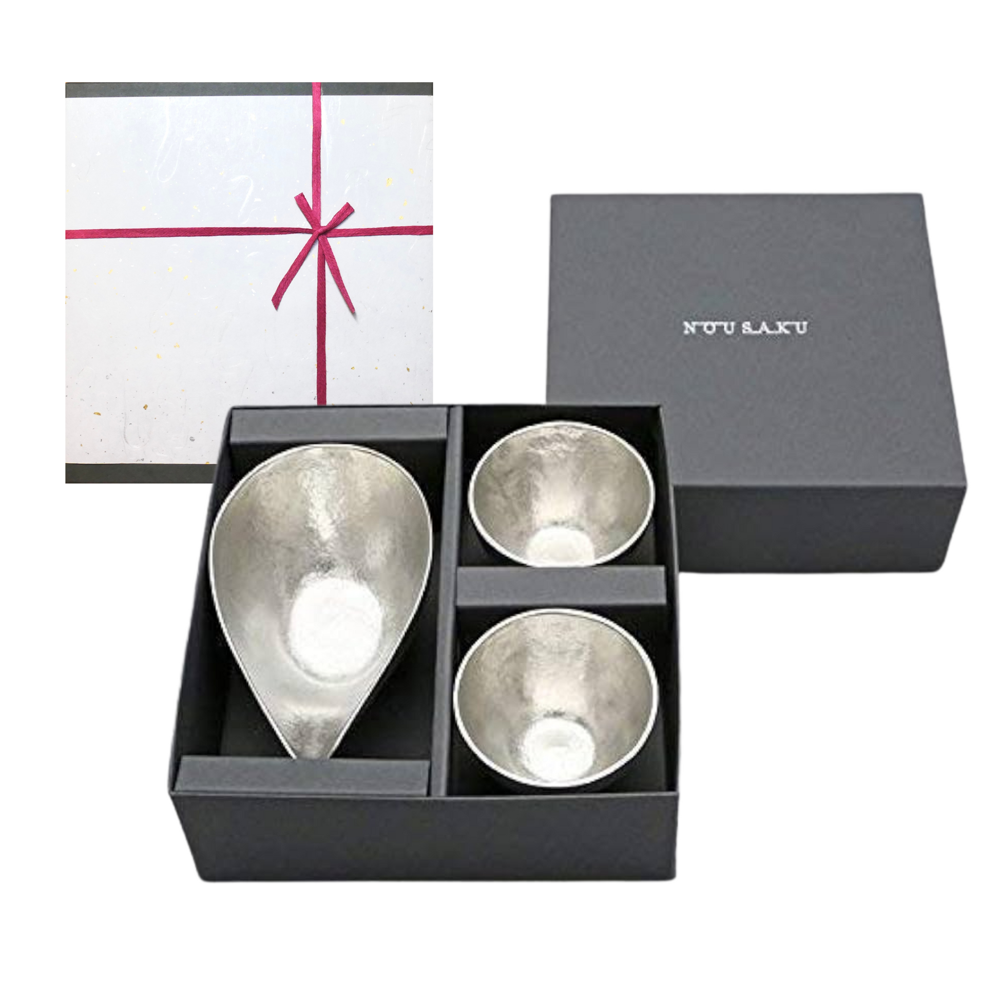 錫100%の片口-中1ケとぐい呑2ケのセットです。錫は古来より、「錫の器に入れた水は腐らない」、「お酒の雑味が抜けて美味しくなる」などといわれ、酒器や茶器などに用いられてきた金属。また、熱伝導率が良いため冷蔵庫に1-2分入れることで器自体が冷たくなり、冷酒がより一層おいしくお楽しみいただけます。一つ一つ職人が手作業で仕上げています。贈り物にもおすすめの商品です。