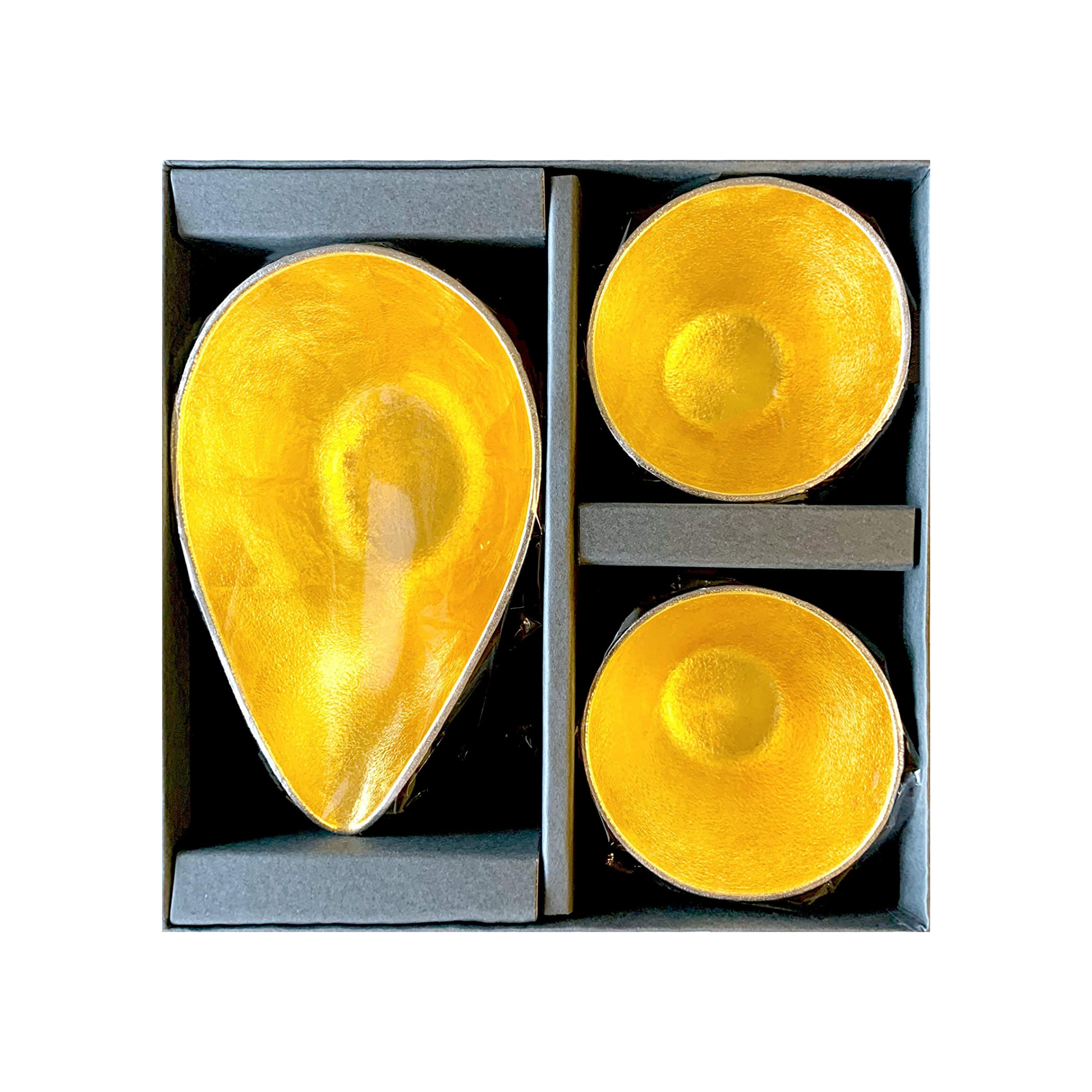 内側に金箔を貼った華やかな印象の錫100%の片口-小金箔1ヶとぐい呑金箔2ヶのセットです。 金沢を代表する伝統工芸品、金箔とコラボレーションしました。